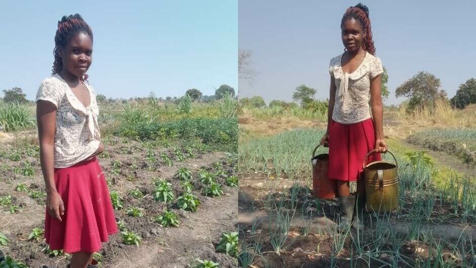 Image caption: Waza Botha a young female smallholder farmer in Zambia scouting